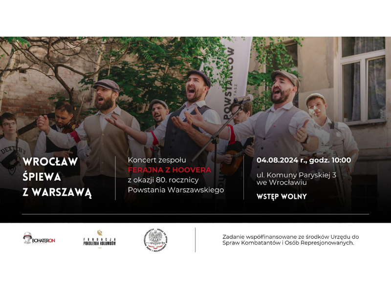 Koncert odbędzie się na podwórku kamienicy Komuny Paryskiej 3, (wejście na podwórko od ul. Hercena) tuż obok niedawno odsłoniętego przez nas muralu “WARSZAWIACY – POWSTAŃCY – WROCŁAWIANIE”. Na uczestników koncertu przygotowaliśmy śpiewniki zachęcające do wspólnego śpiewania.